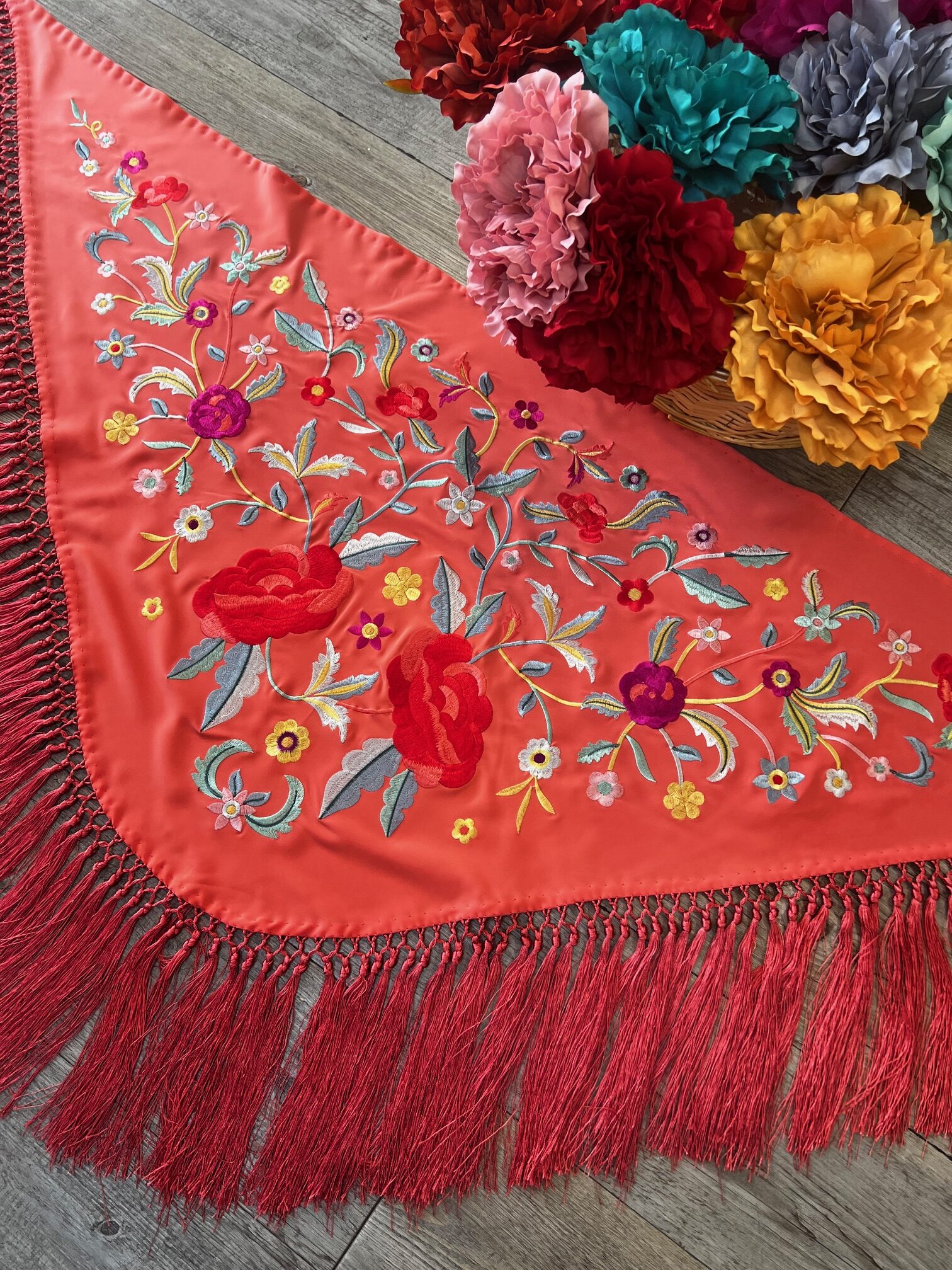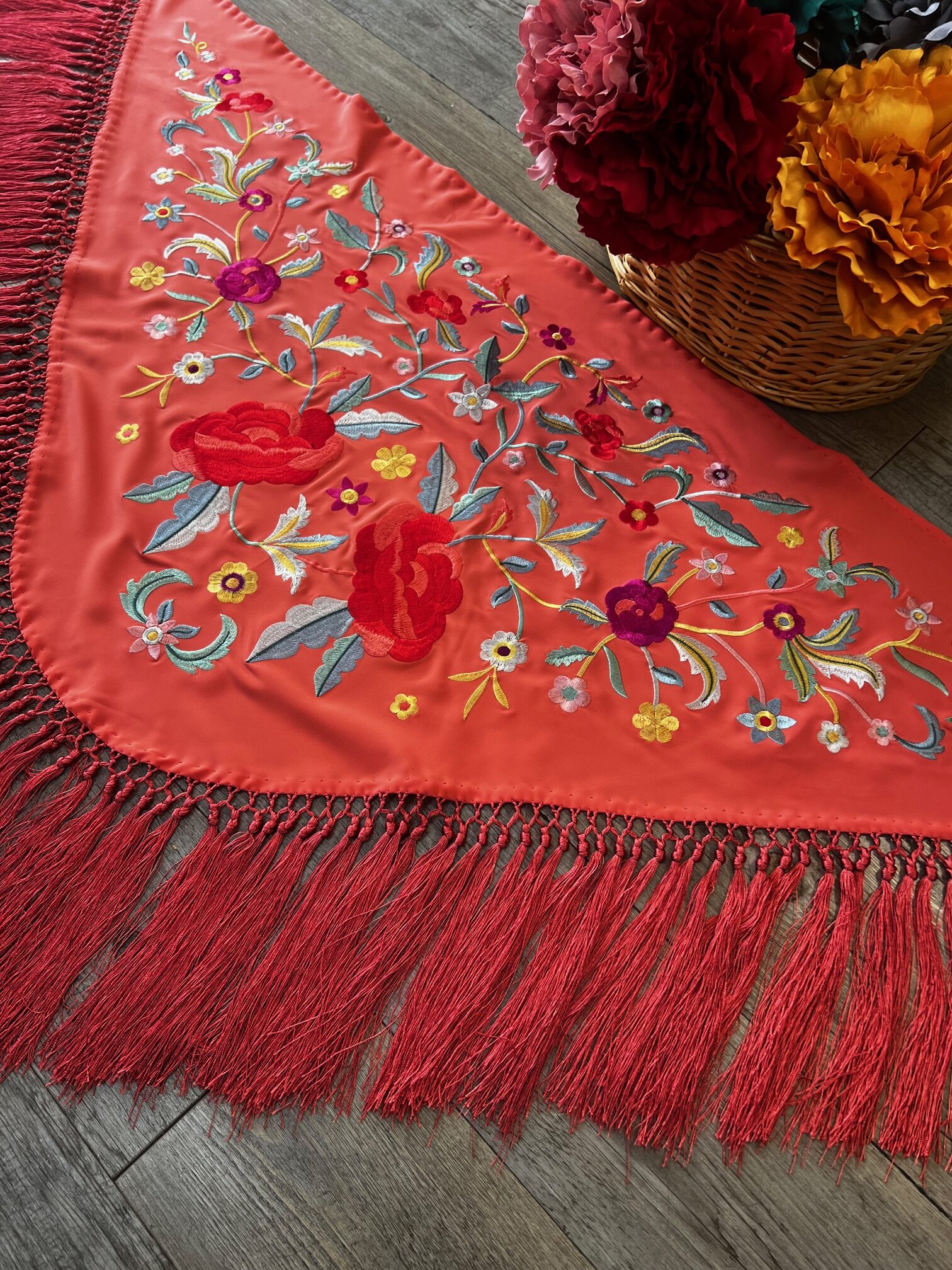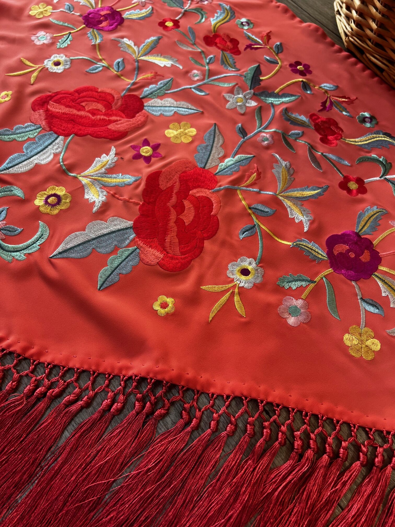 Mantón en seda bordado multicolor y fondo coral, con fleco corto anudado a mano.