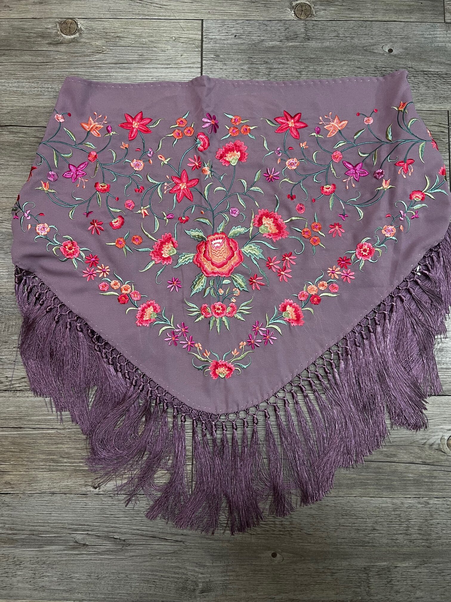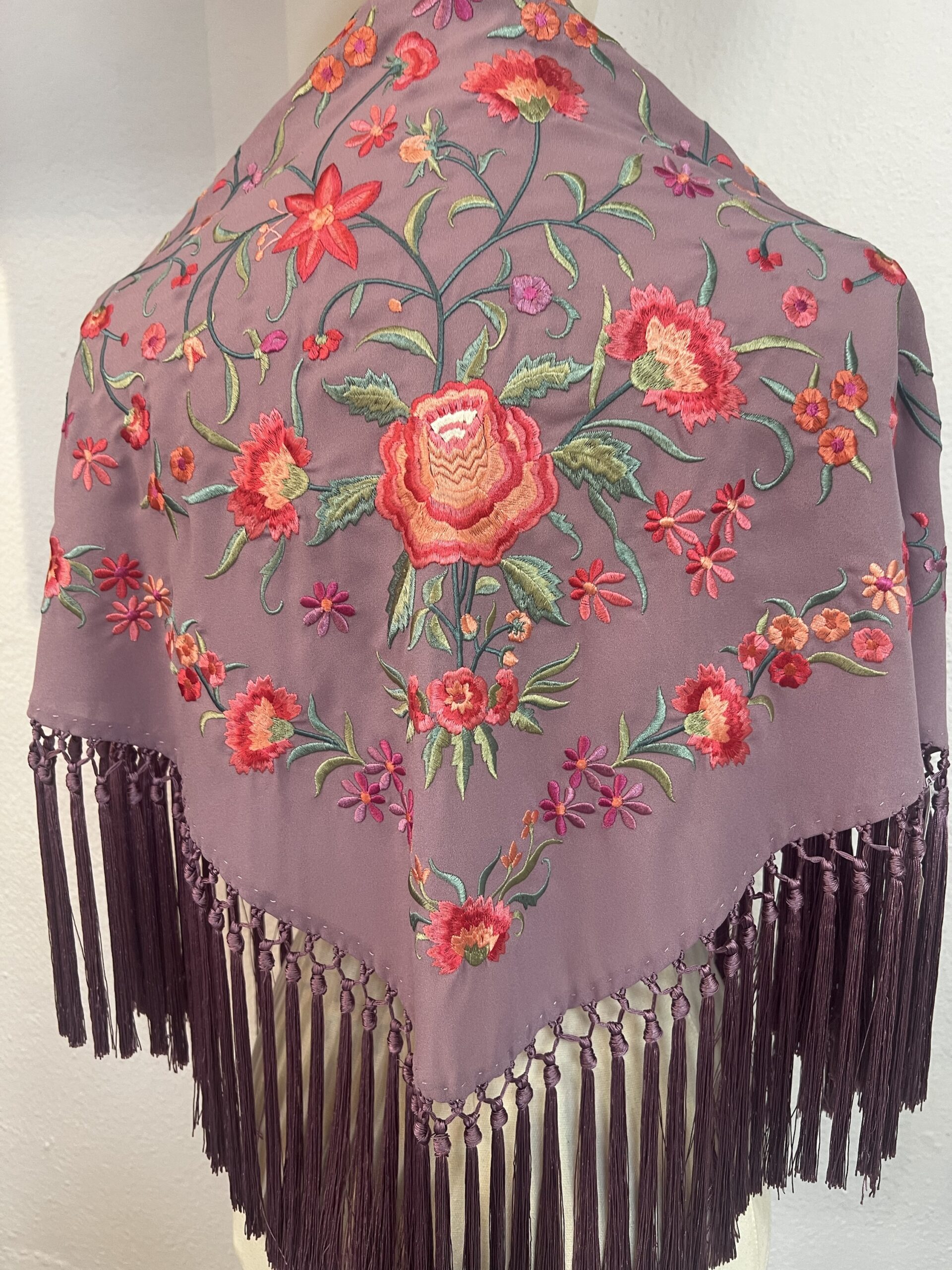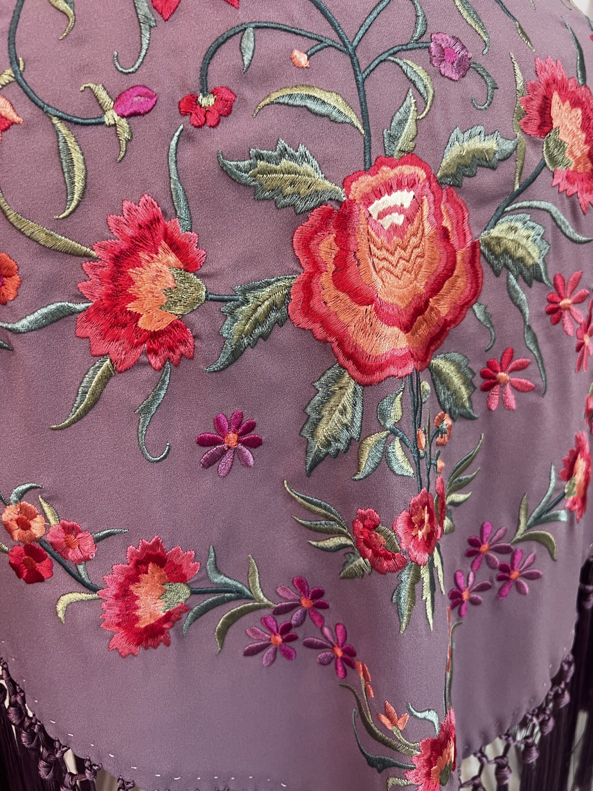Mantoncillo bordado, y flecado a mano, en lila pastel, bordado con rosas y claveles.
