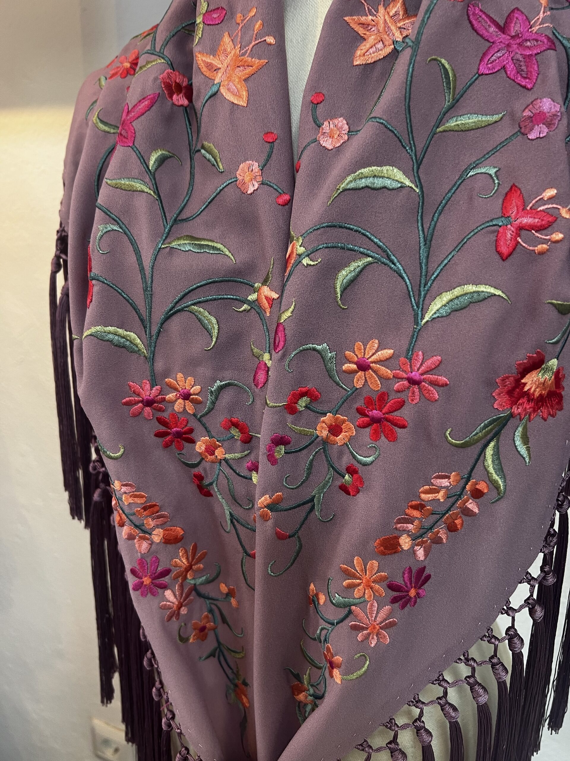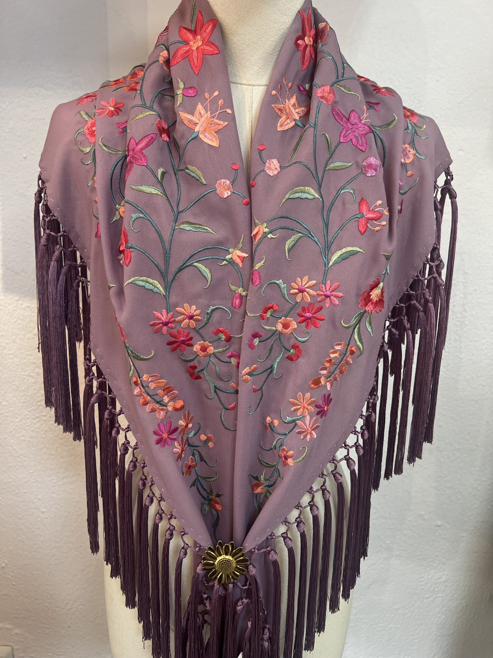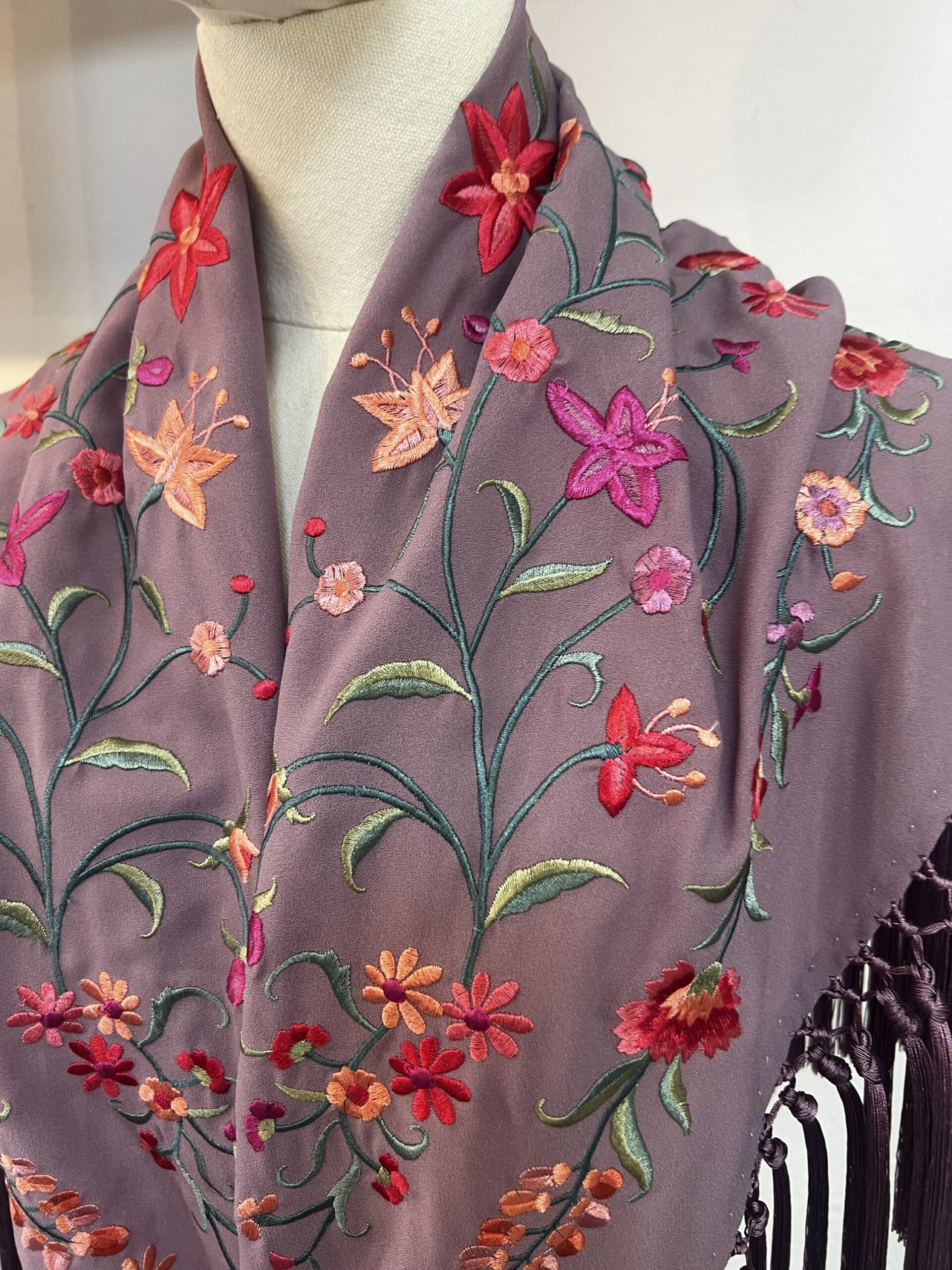Mantoncillo bordado, y flecado a mano, en lila pastel, bordado con rosas y claveles.