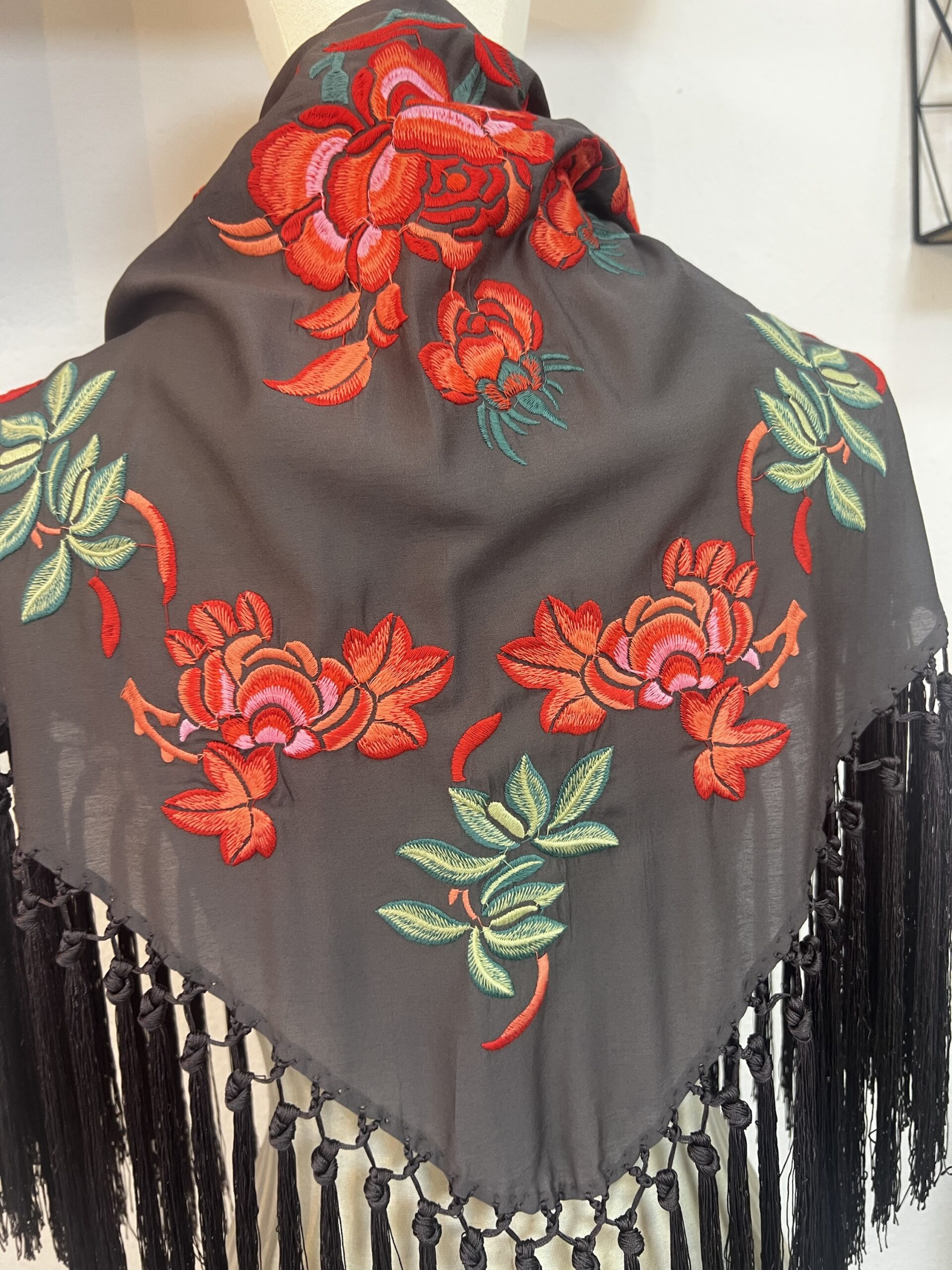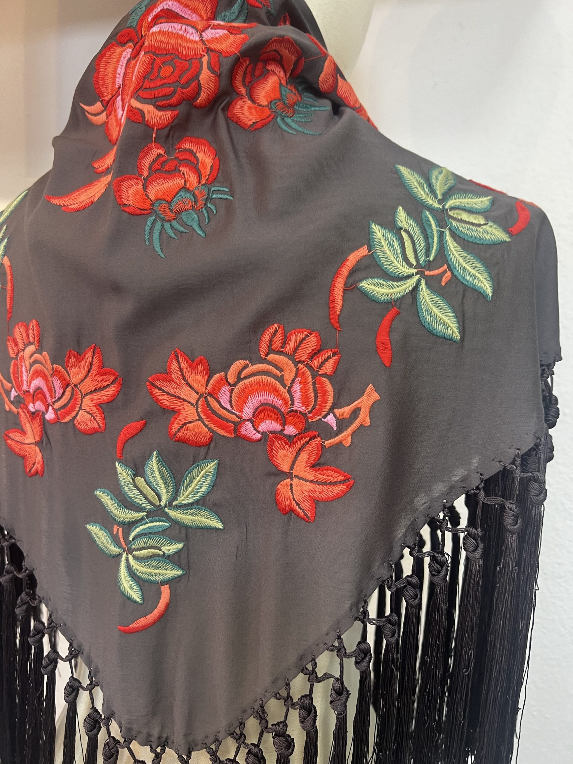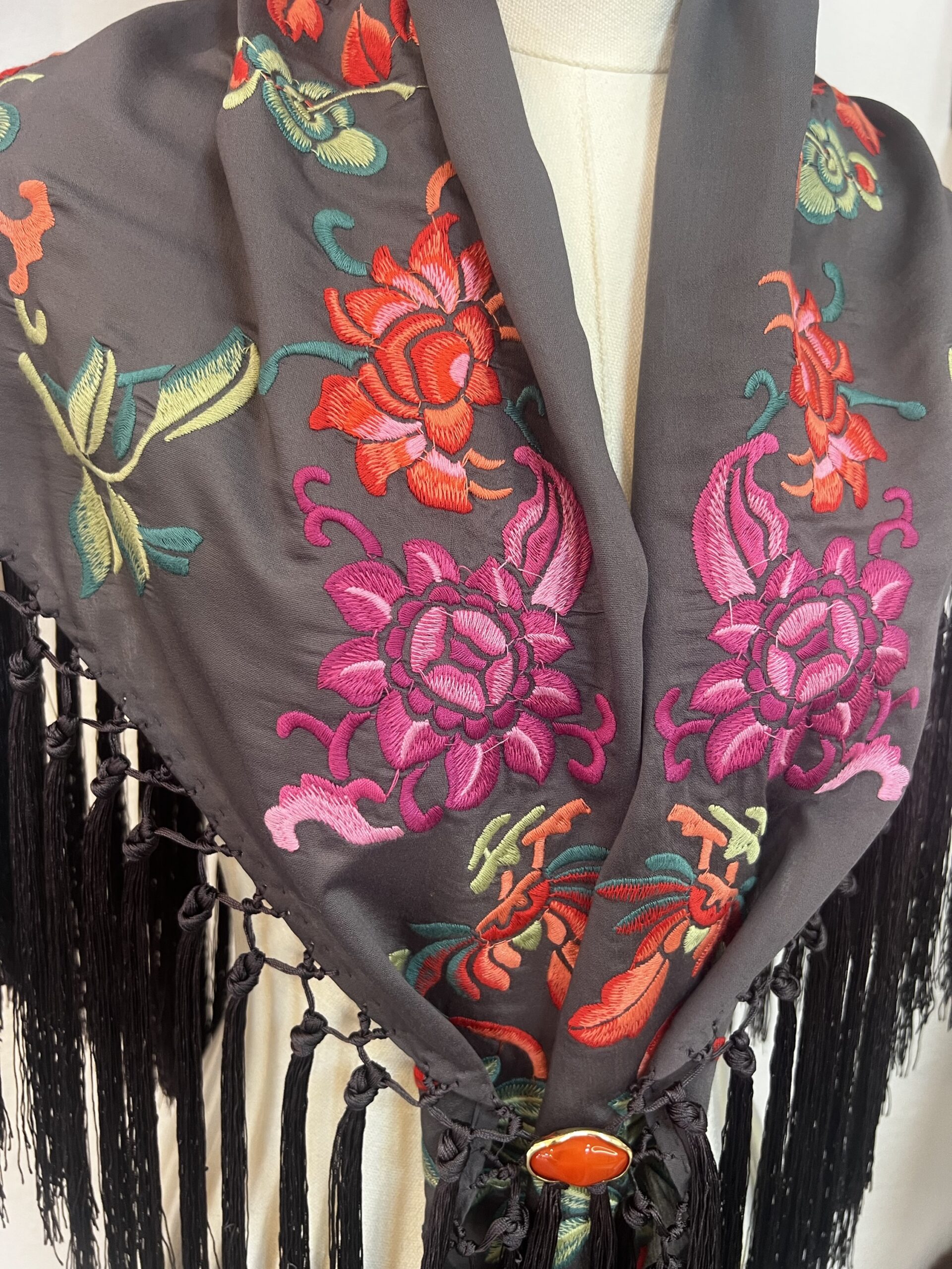 Mantoncillo fluido fondo gris con flores coral y verdes