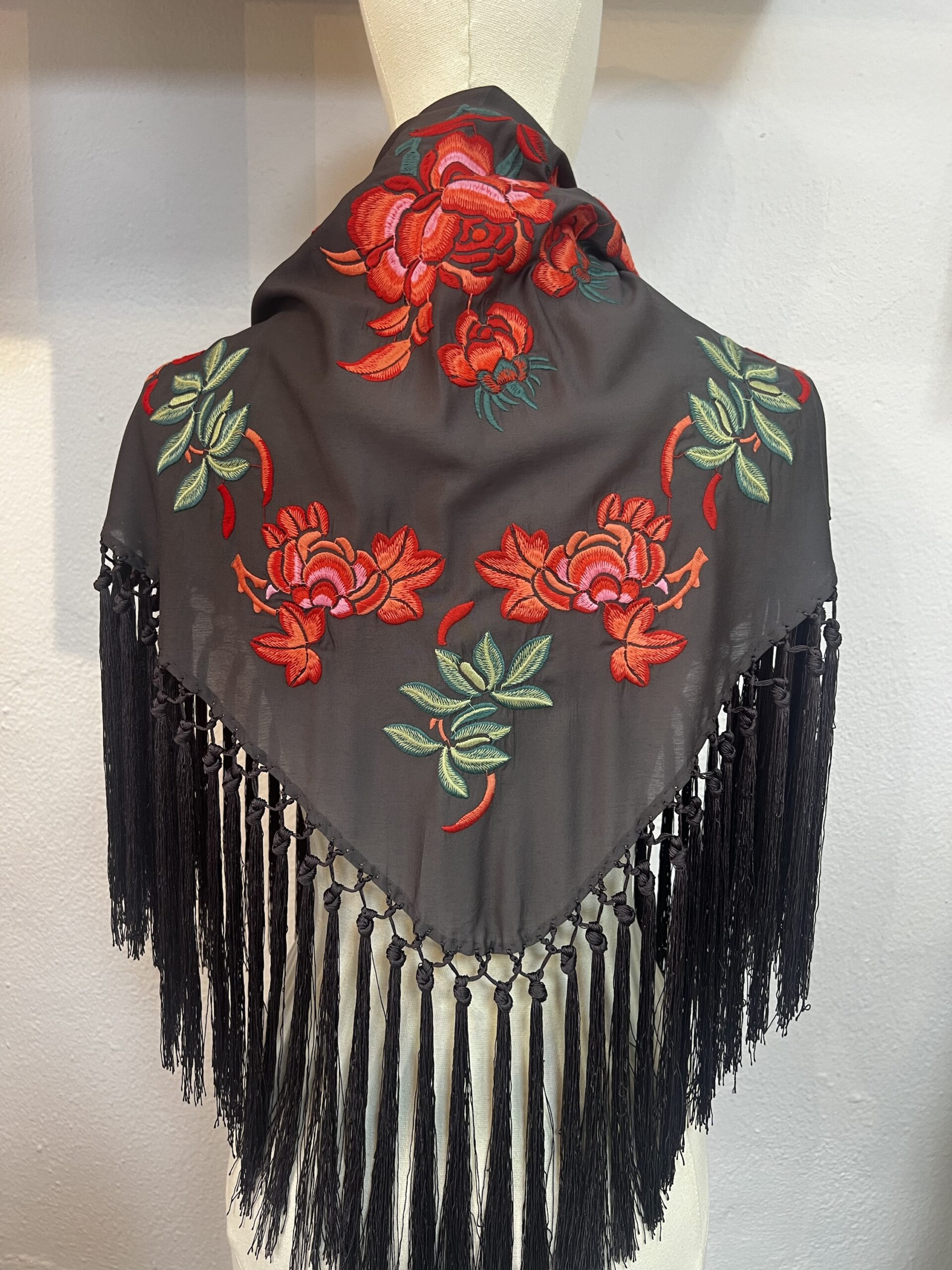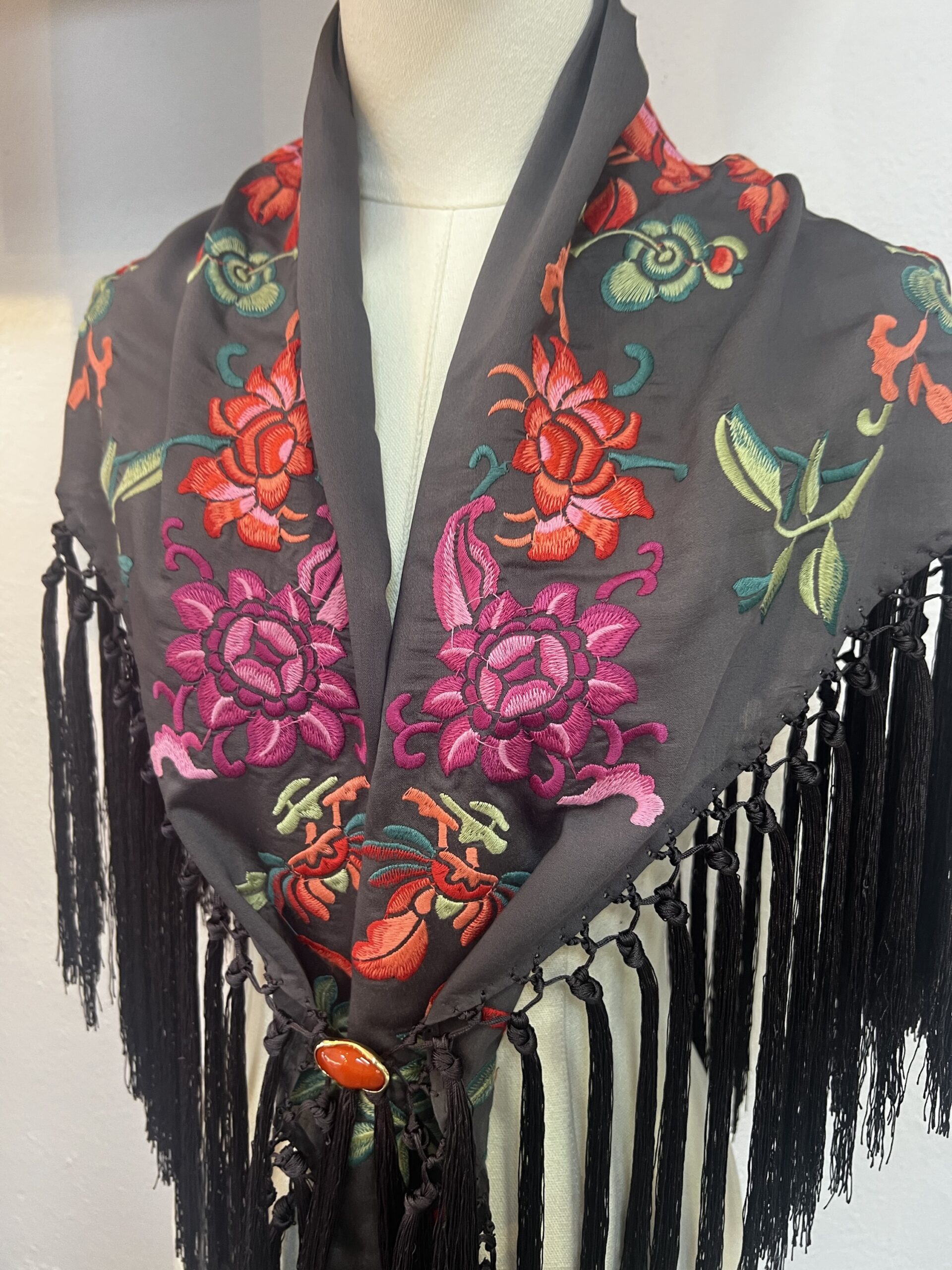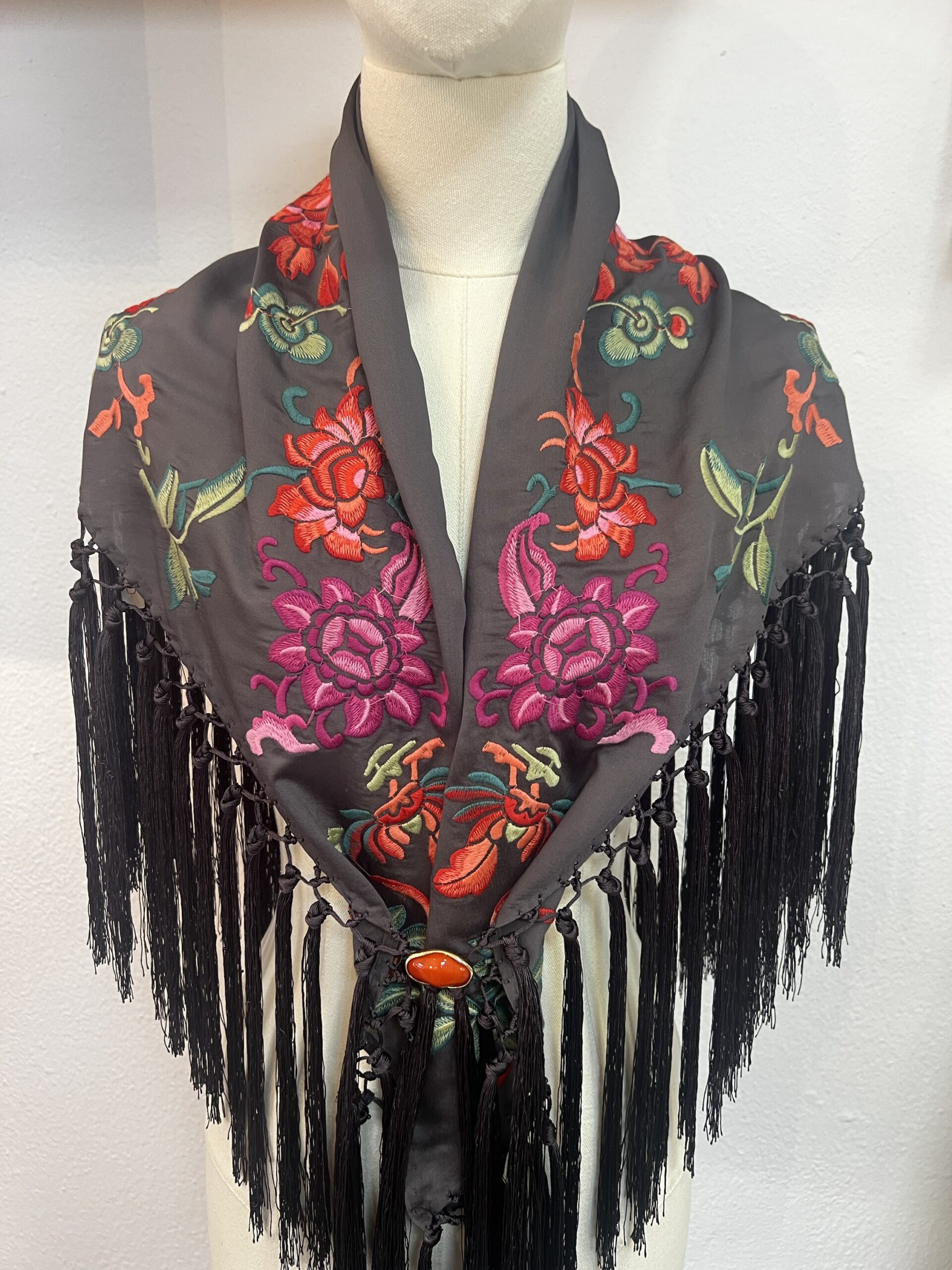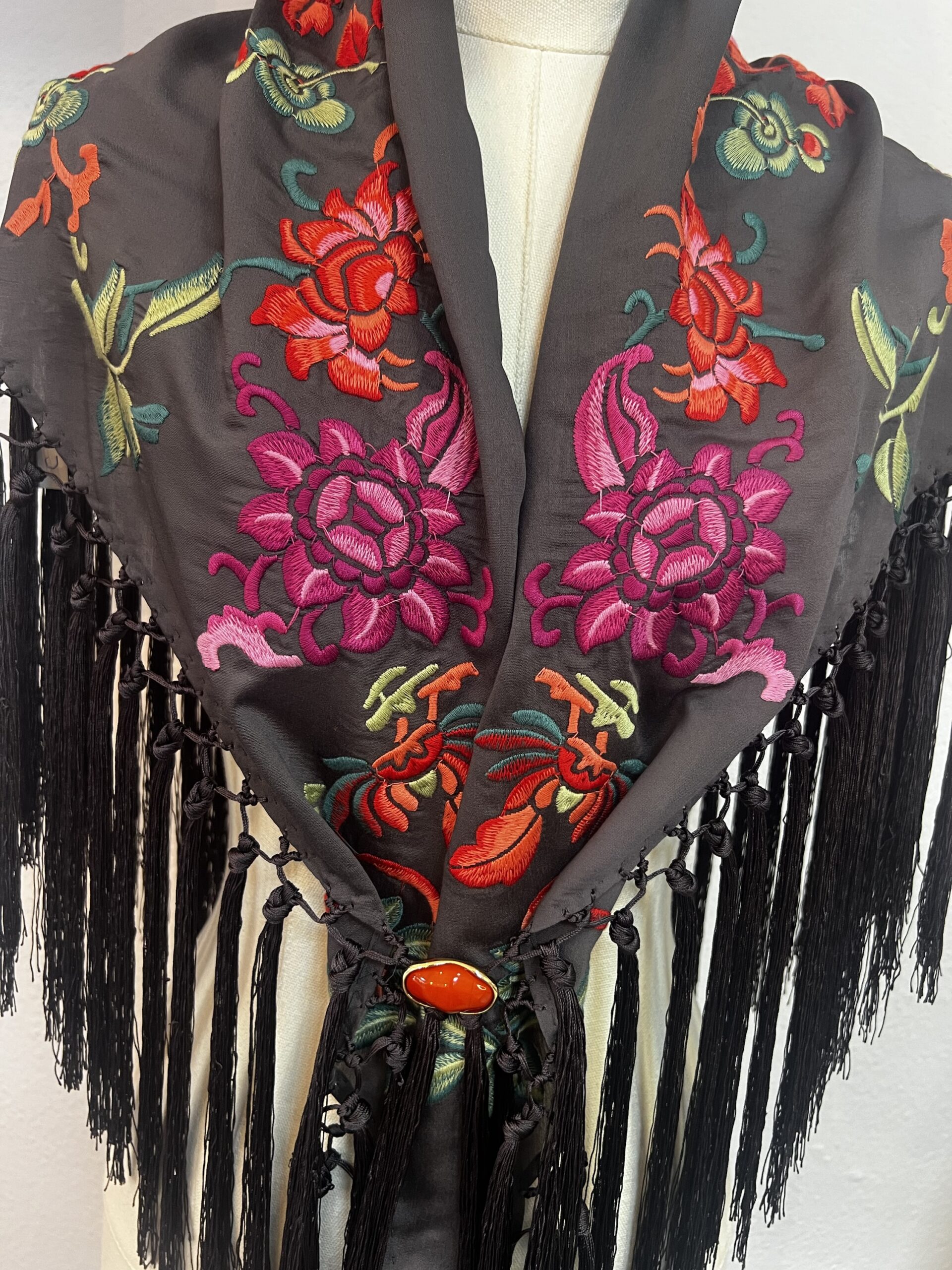 Mantoncillo fluido fondo gris con flores coral y verdes