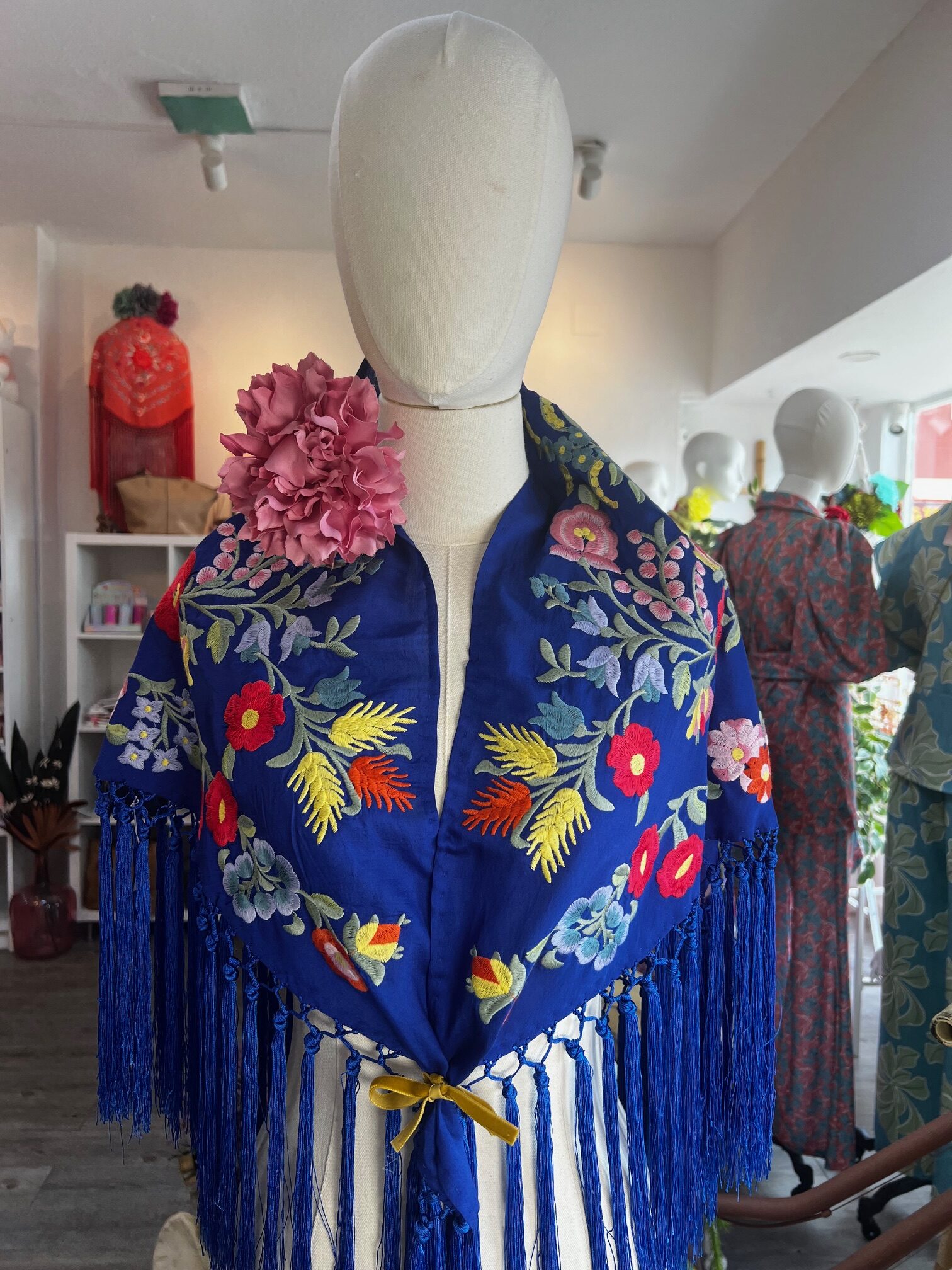 Precioso mantoncillo , fondo azulino y muy bordado de flores, en diferentes colores. Fleco corto